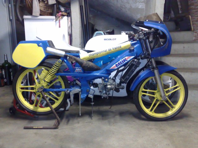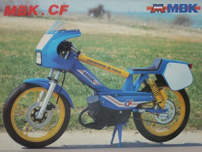 en 1987 il y a eu la premiere version du moteur mbk g2 en liquide (avant le g2 etait a air !!!) dont le pot passe sur le coté de la selle ( et oui sa brule !!!) , puis par la suite le g2 88 tout carené et enfin le 51 cf 90 avec son cadre equipé d’une poutre et d’un bras alu .